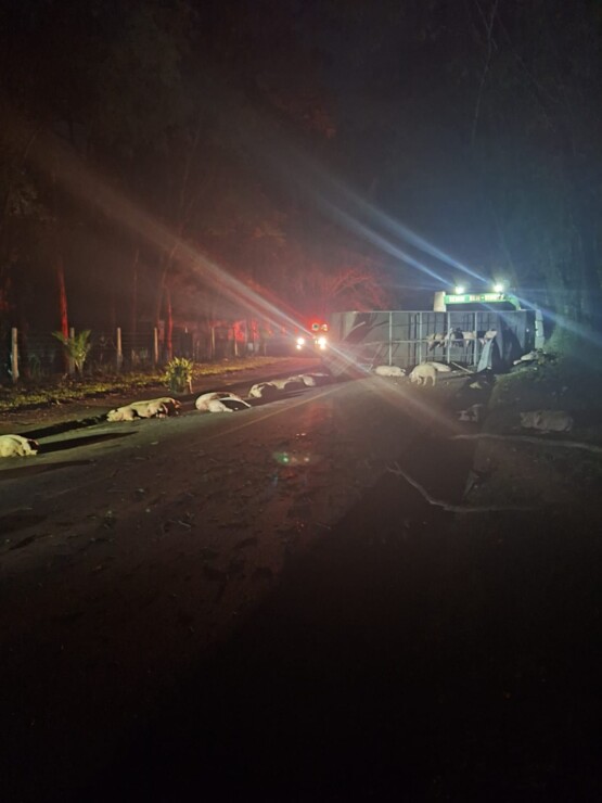 Um caminhão carregado com 82 suínos tombou na madrugada desta quinta-feira (5) na rodovia SC-283, no município de Caibi, Oeste de Santa Catarina. O acidente ocorreu por volta das 00h05, no km 167,9 da via. Apesar do impacto, o motorista de 26 anos não sofreu ferimentos.
